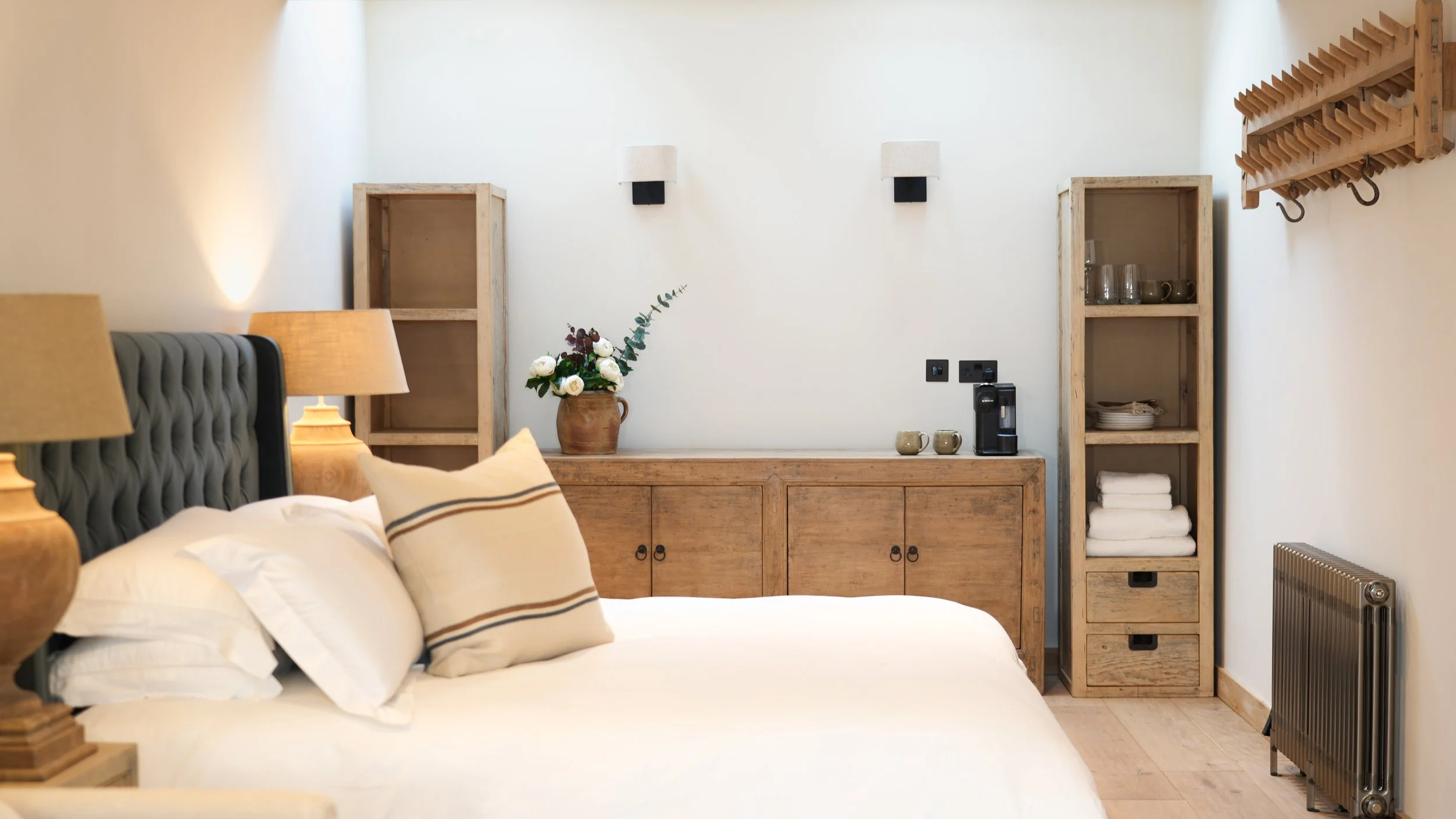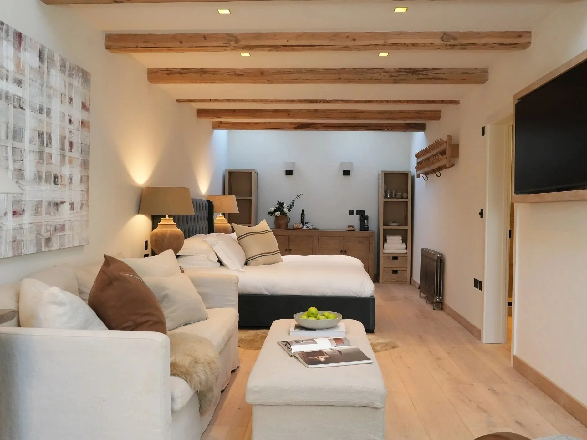 The Music Room is an open-plan luxury studio apartment with a contemporary shower en-suite. Set in the heart of Moreton-in-Marsh, The Cotswolds, it features a kitchenette and a TV sofa area. As with all of our signature standard properties, it is interior-designed by Cotswold Grey and features premium Belgian linen sofas, reclaimed elm furniture and exposed stone highlights. It’s the ideal space for 2.